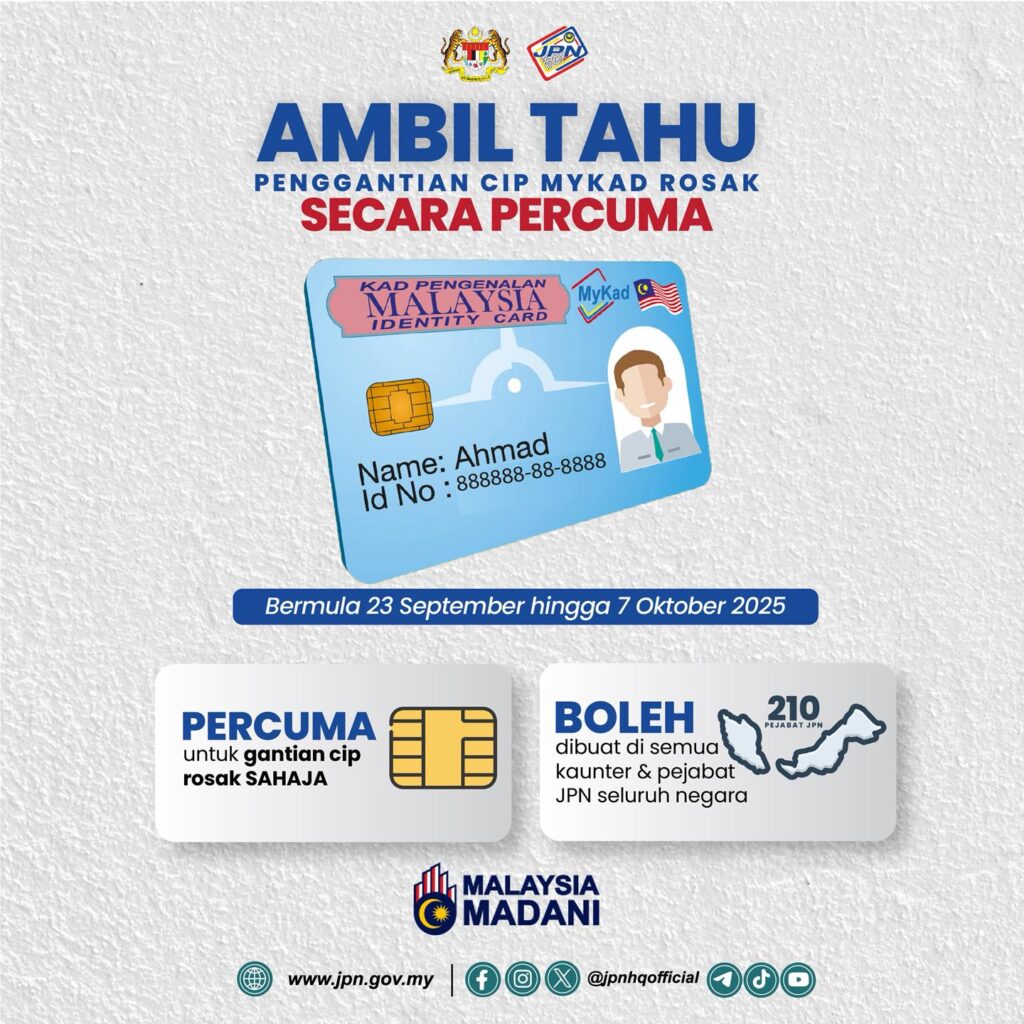 Selaras dengan pengumuman YB Menteri Dalam Negeri, mulai 23 September hingga 7 Oktober 2025, JPN menawarkan gantian cip MyKad rosak secara PERCUMA di semua pejabat dan kaunter JPN seluruh negara.