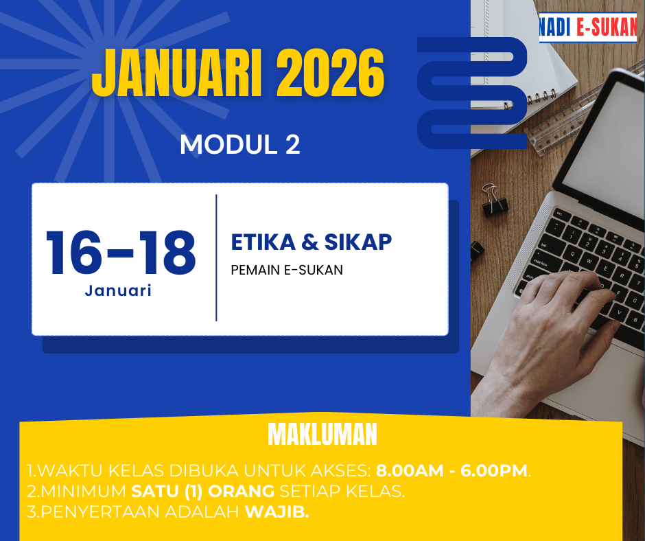 Dengan segala hormatnya dimaklumkan bahawa pihak NADI E-Sukan akan melaksanakan kelas kesedaran dalam LMS NADI E-Sukan bagi minggu ketiga bulan Januari 2026 seperti ketetapan berikut: