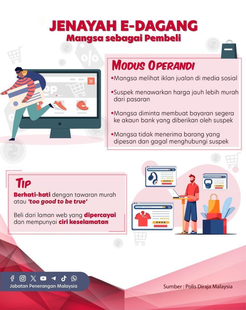 Jangan mudah terpedaya—banyak jenayah e-dagang bermula dengan iklan harga rendah yang mencurigakan.