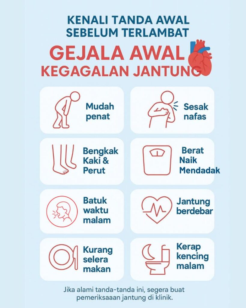 Jantung berfungsi sebagai pam utama tubuh mengepam darah yang membawa oksigen dan nutrien ke seluruh badan. Bila pam ini mula lemah, aliran darah jadi perlahan.