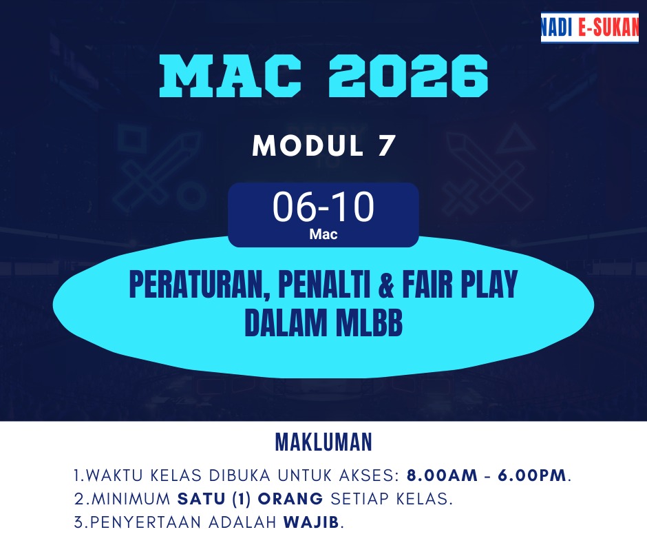 Dimaklumkan bahawa kelas kesedaran dalam LMS NADI E-Sukan akan dilaksanakan seperti ketetapan berikut: